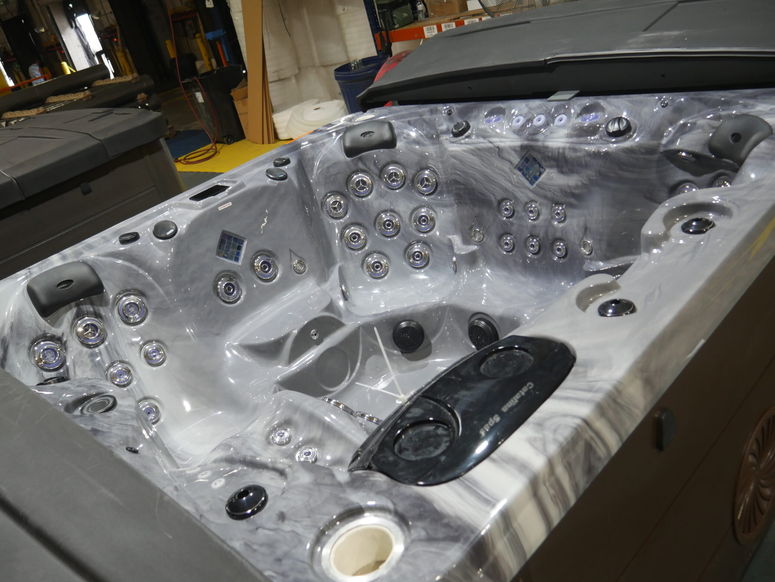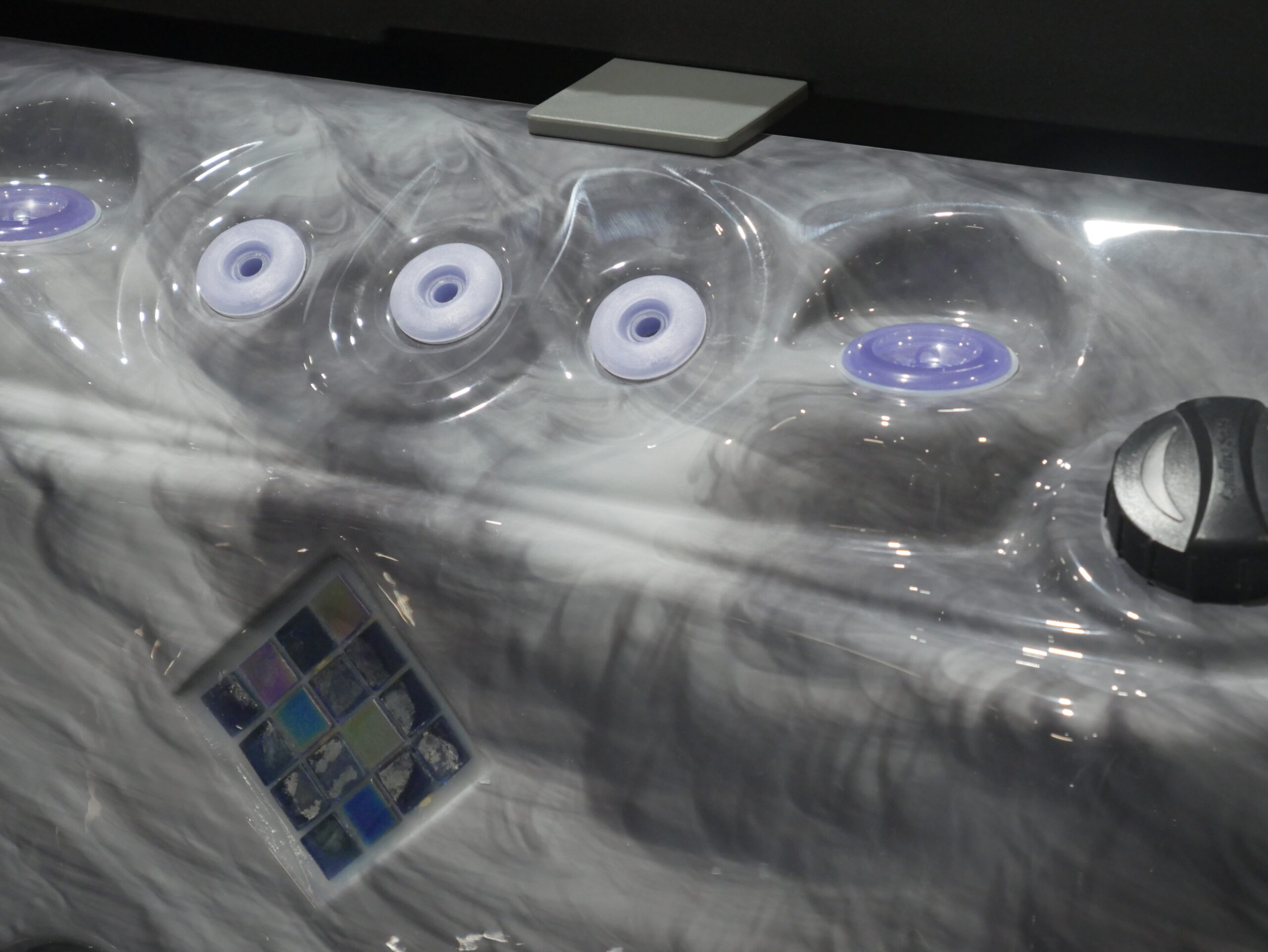 This luxurious spa designed for six people, built with storm cloud acrylic, complemented by sleek chestnut cabinets, and has been upgraded to include extreme foam, fire features, auto-fill, misters, and a chiller giving your spa the ability to cool as low as 70 degrees.