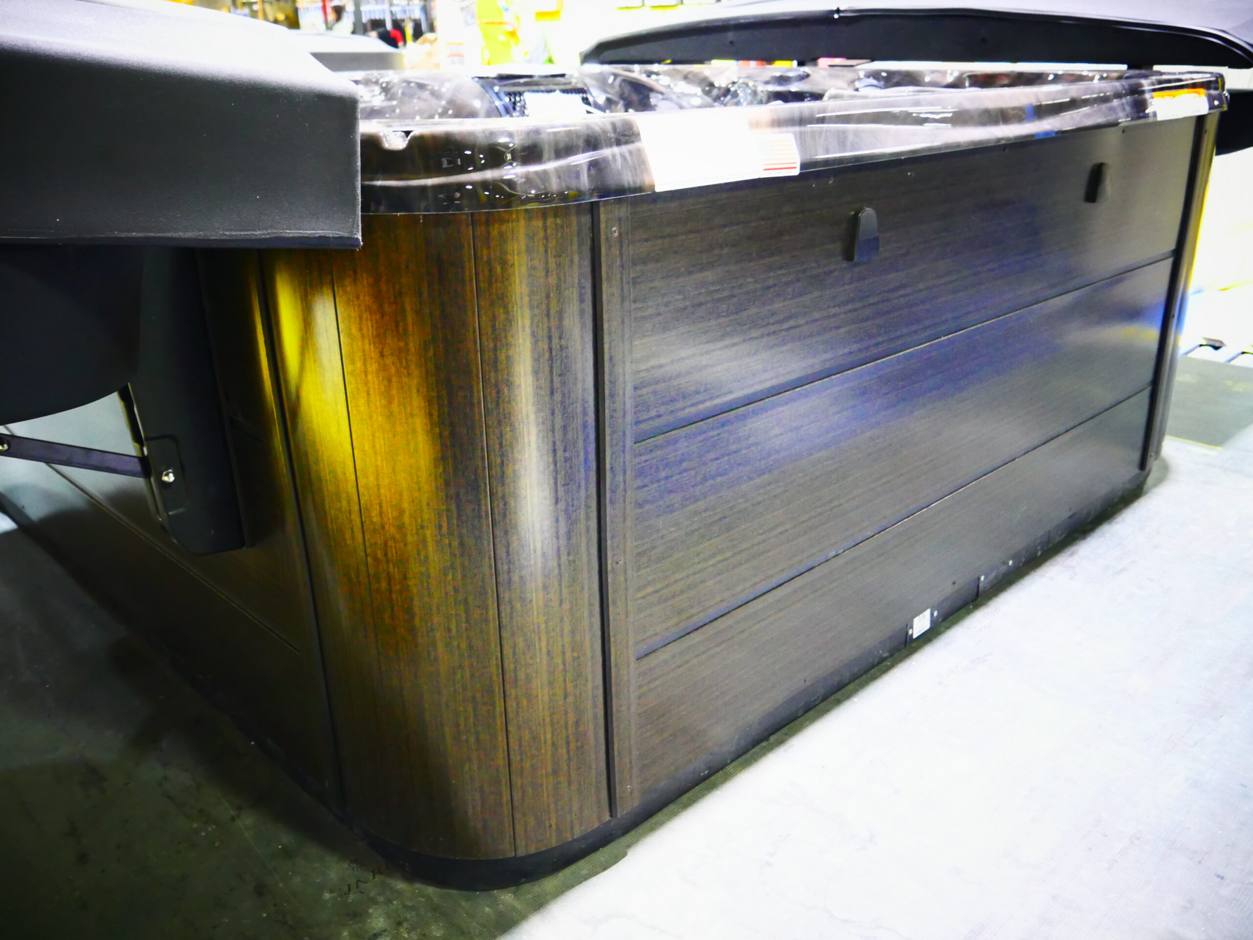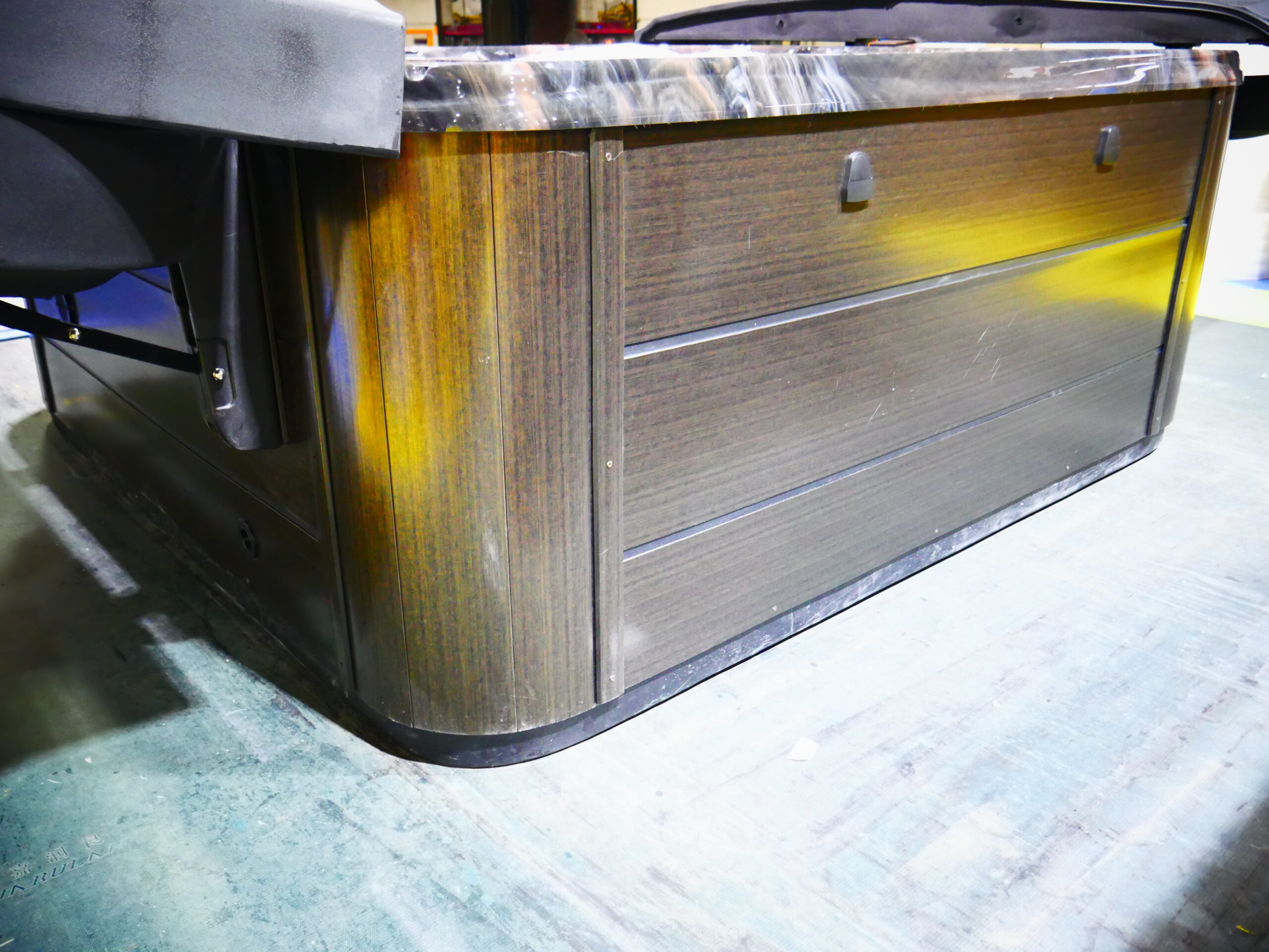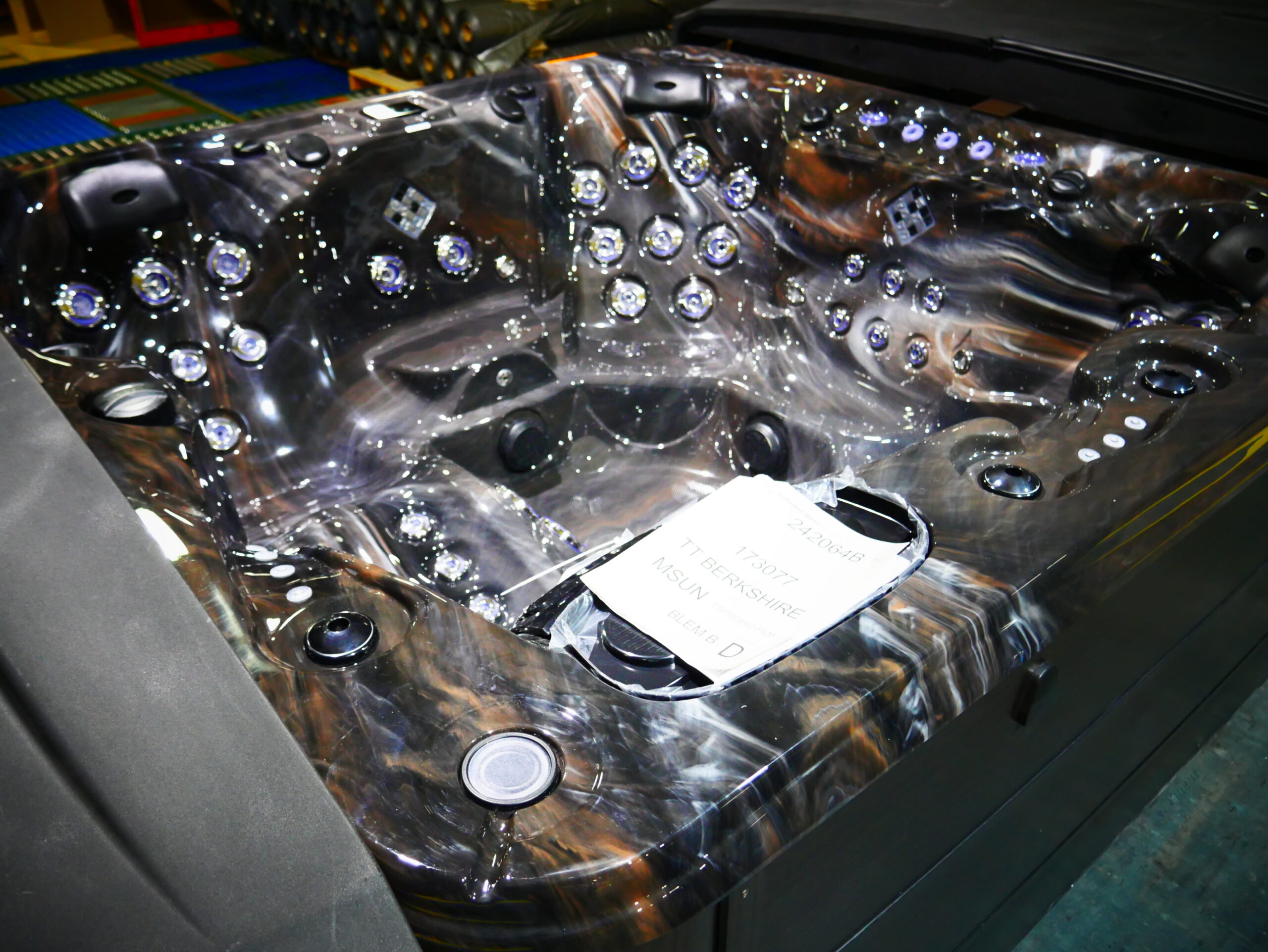 This luxurious spa designed for six people, features a stunning tuff top, midnight canyon acrylic and is complemented by sleek espresso cabinets.