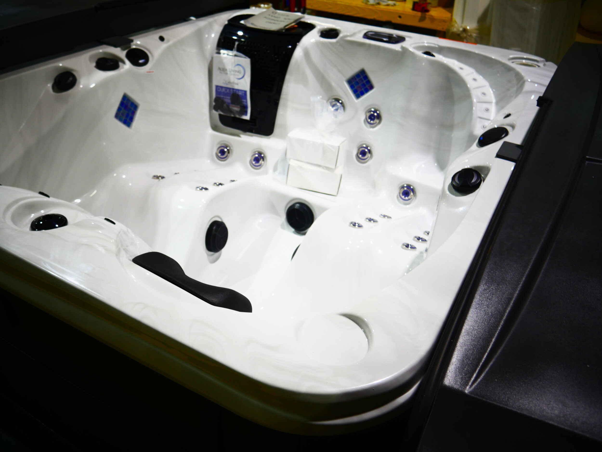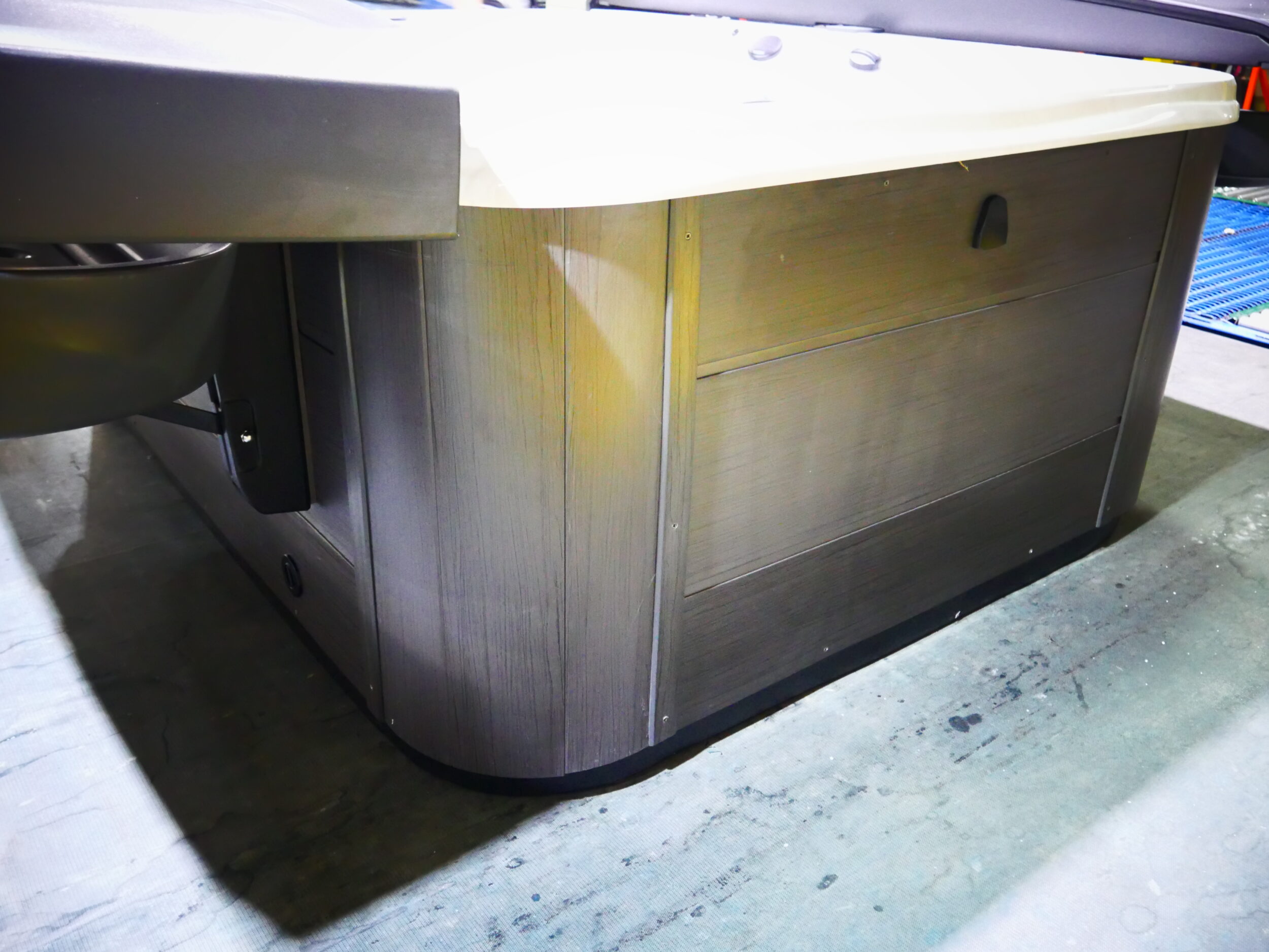 Designed for 3 people to enjoy comfort & luxury. This unit is made with our Tuff Top cover, Sterling acrylic, Graphite cabinets and has been upgraded to include Mist, Fire Features and AutoFill.