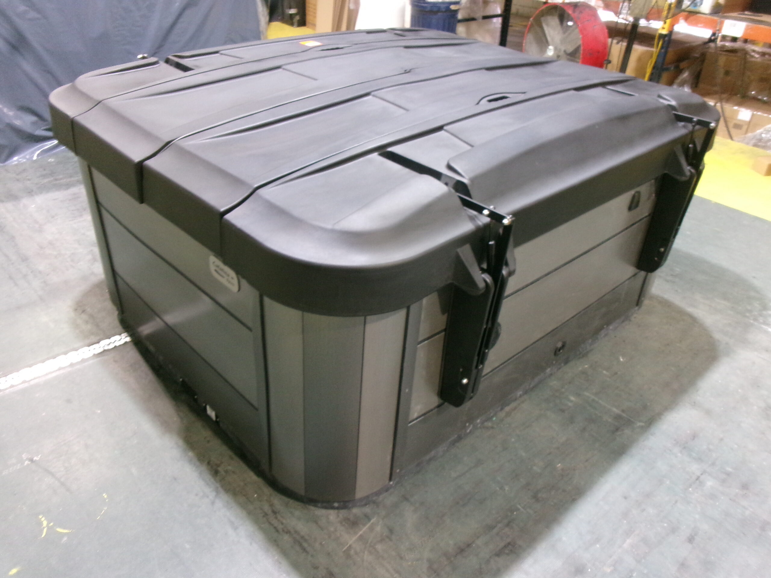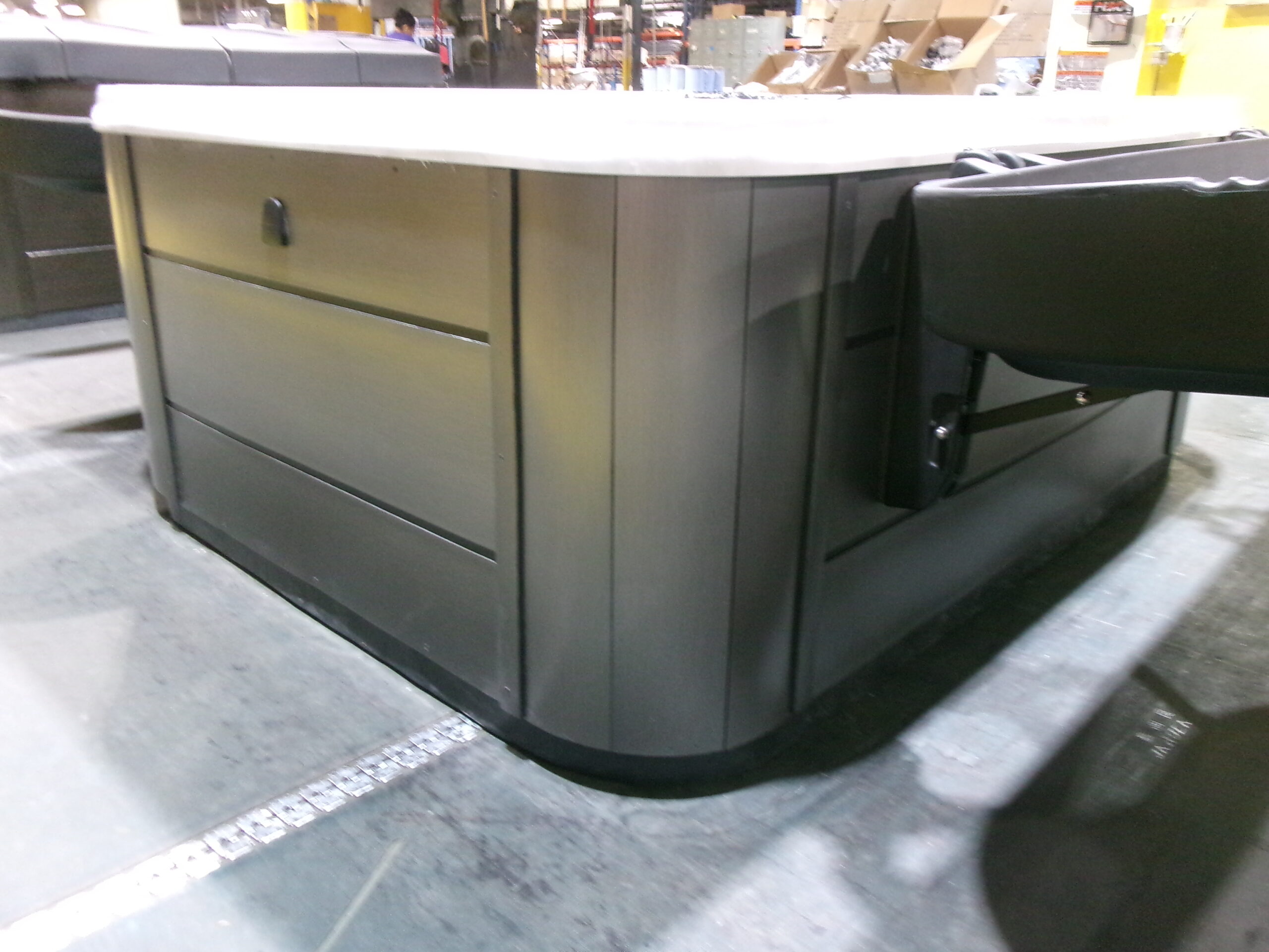 Designed for 3 people to enjoy comfort & luxury. This unit is made with our Tuff Top cover, sterling acrylic and slate cabinets.