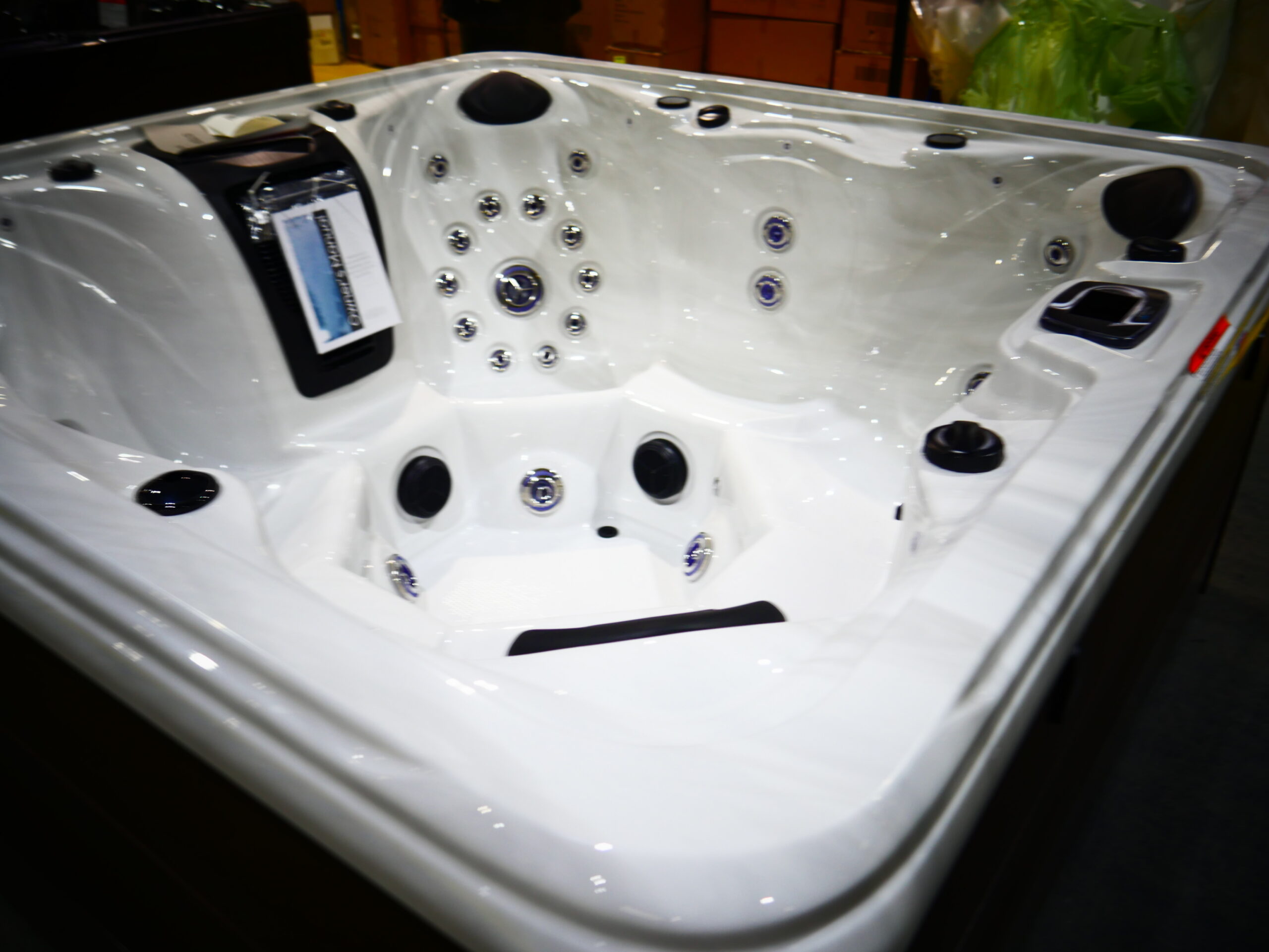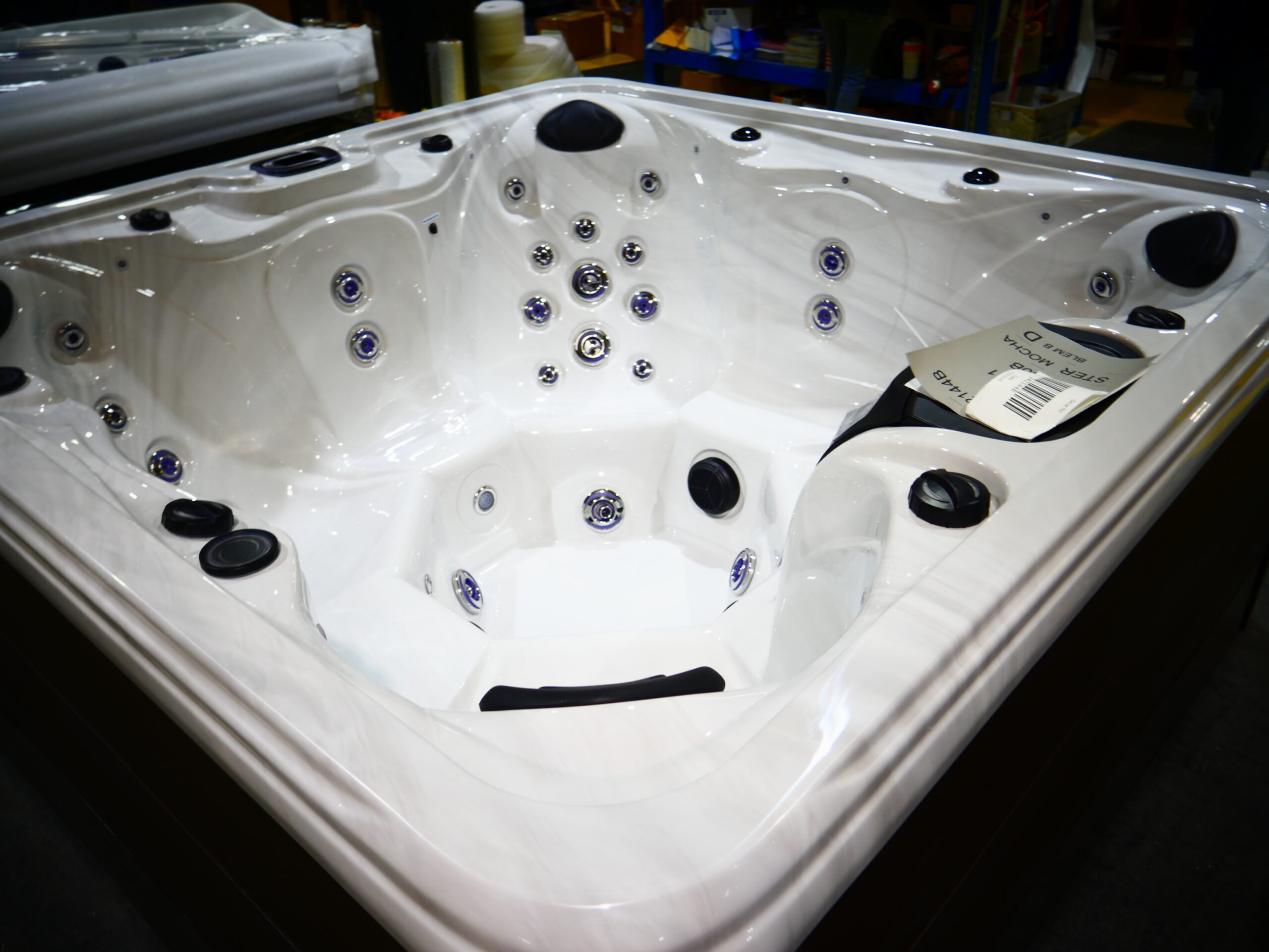 This spa is designed to for the whole family with over 50 jets and 7 seats. This spa was made with our sterling acrylic and mocha panels.