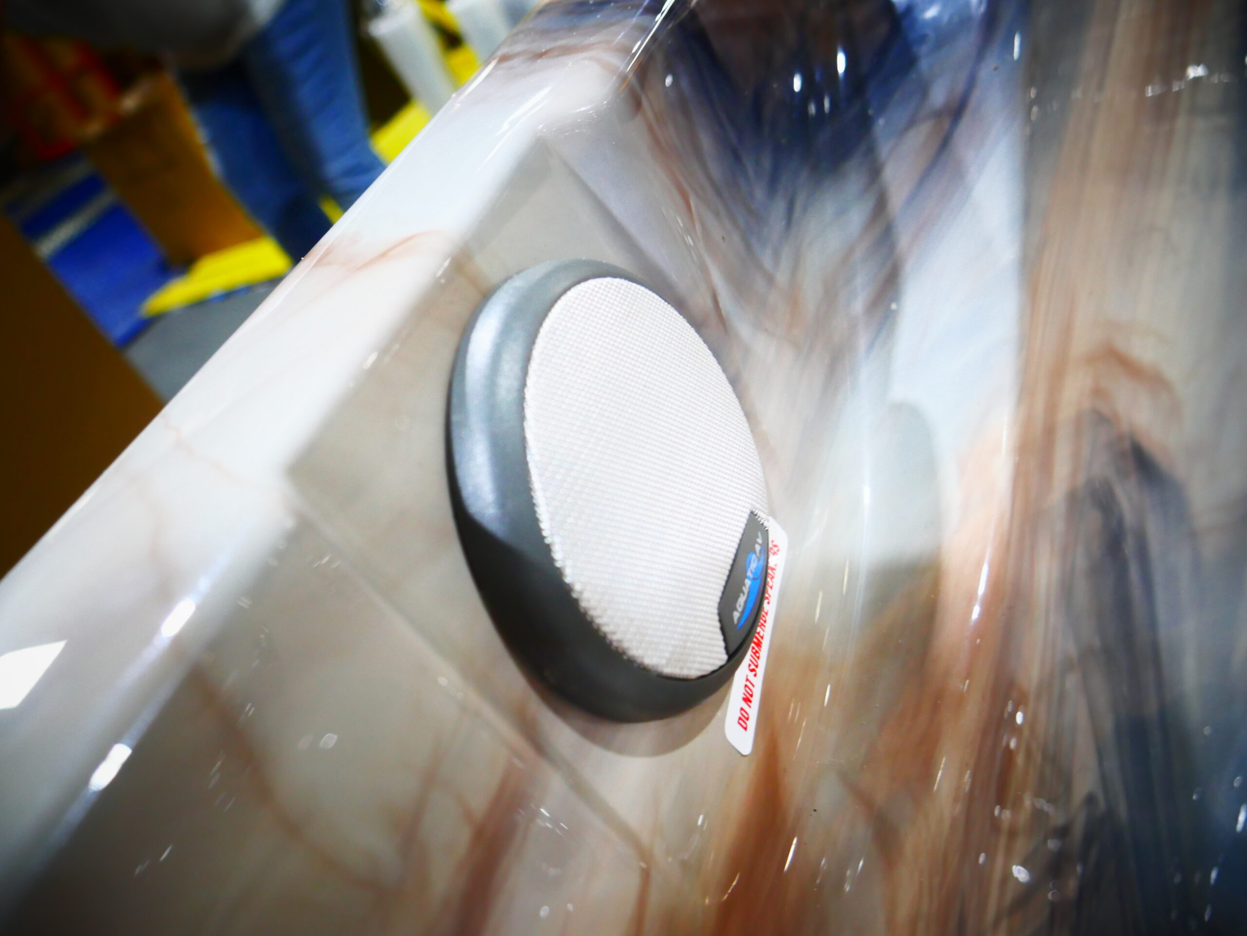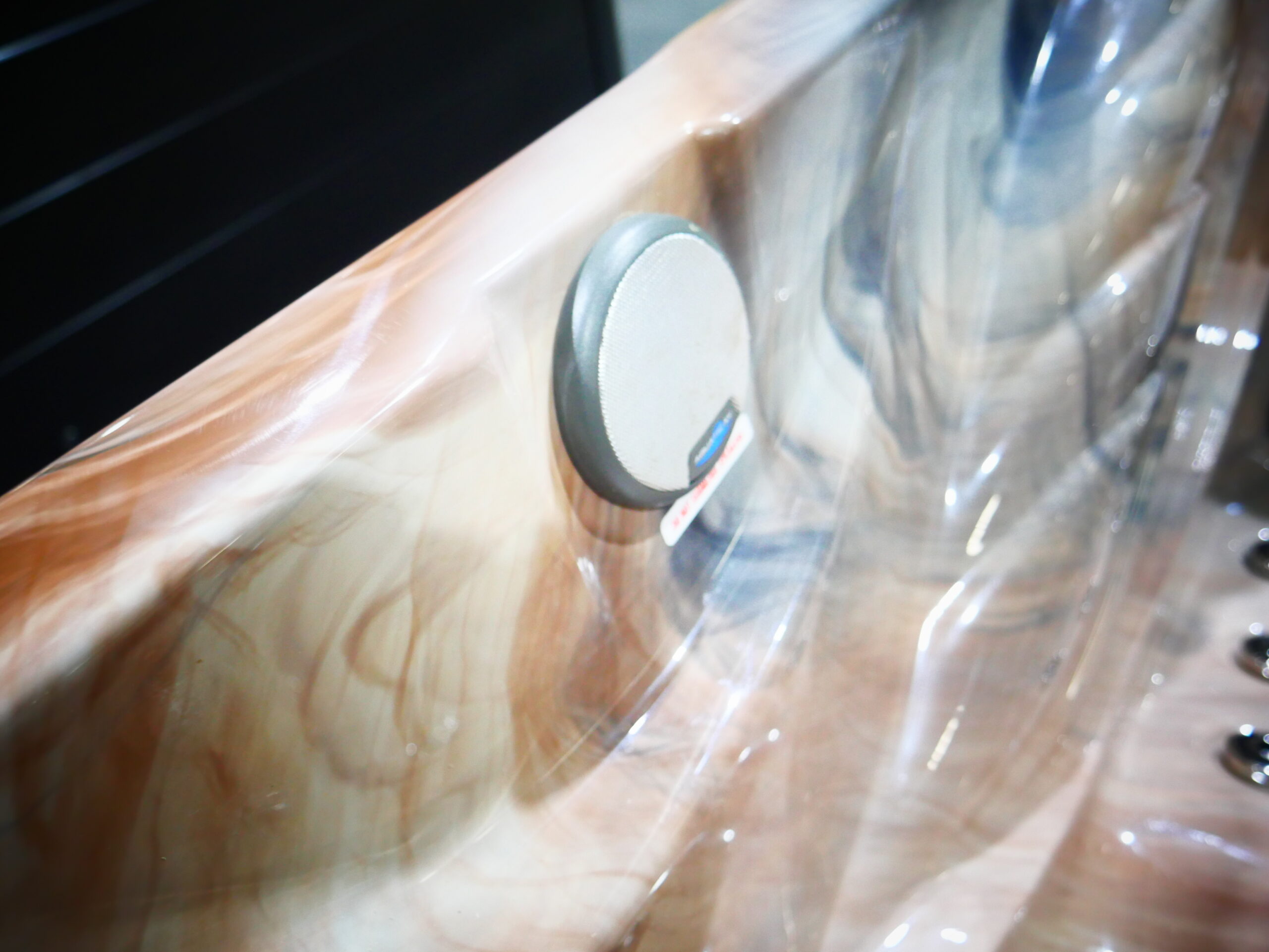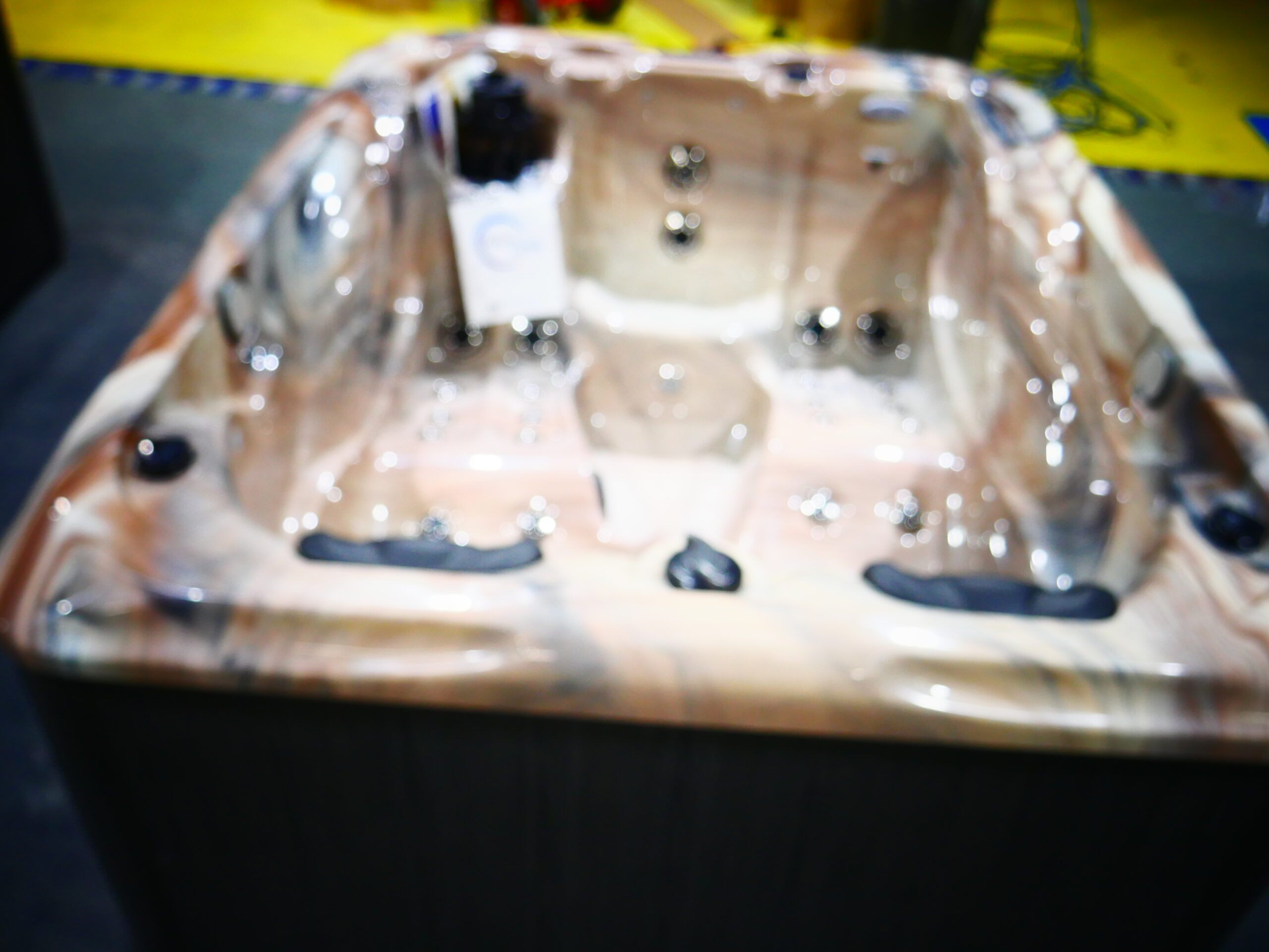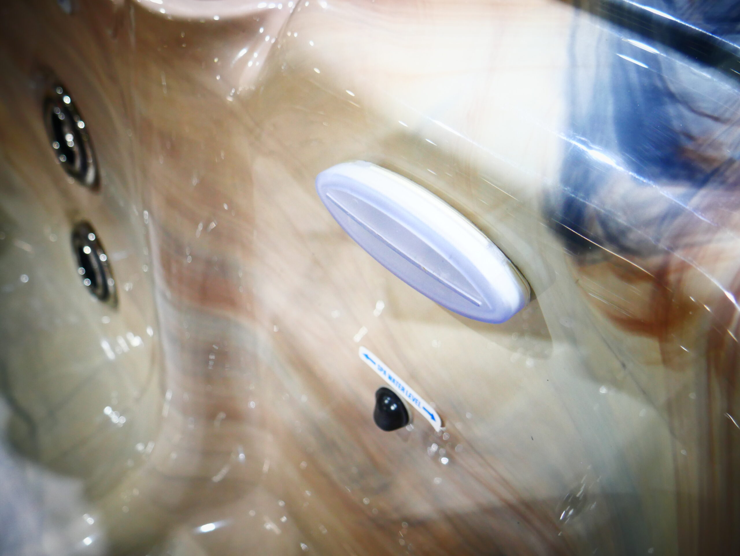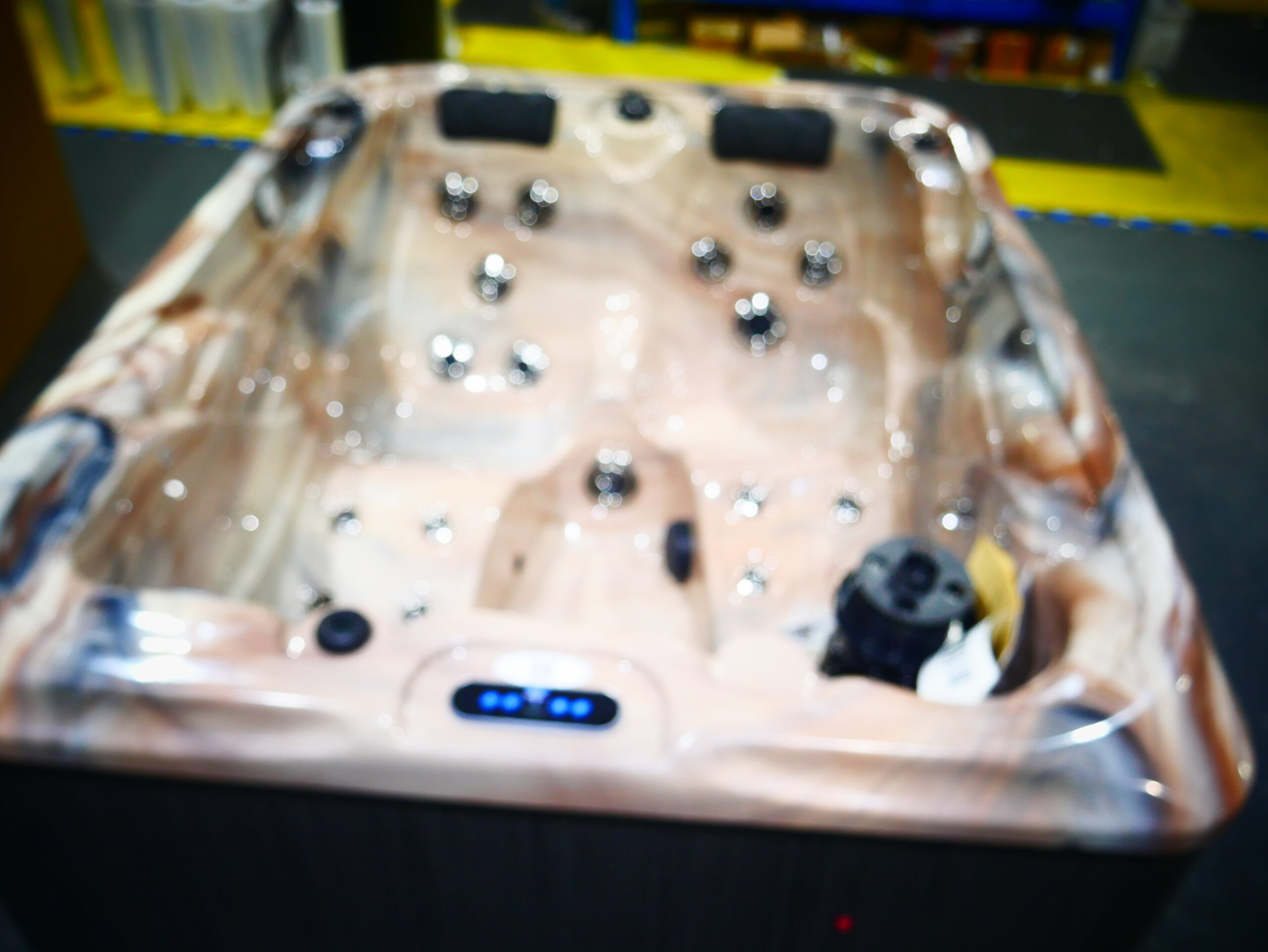 This spa is designed for 3 people to enjoy, including dual loungers for a full body massage. This unit is made with tuscan acrylic and gray cabinets.
