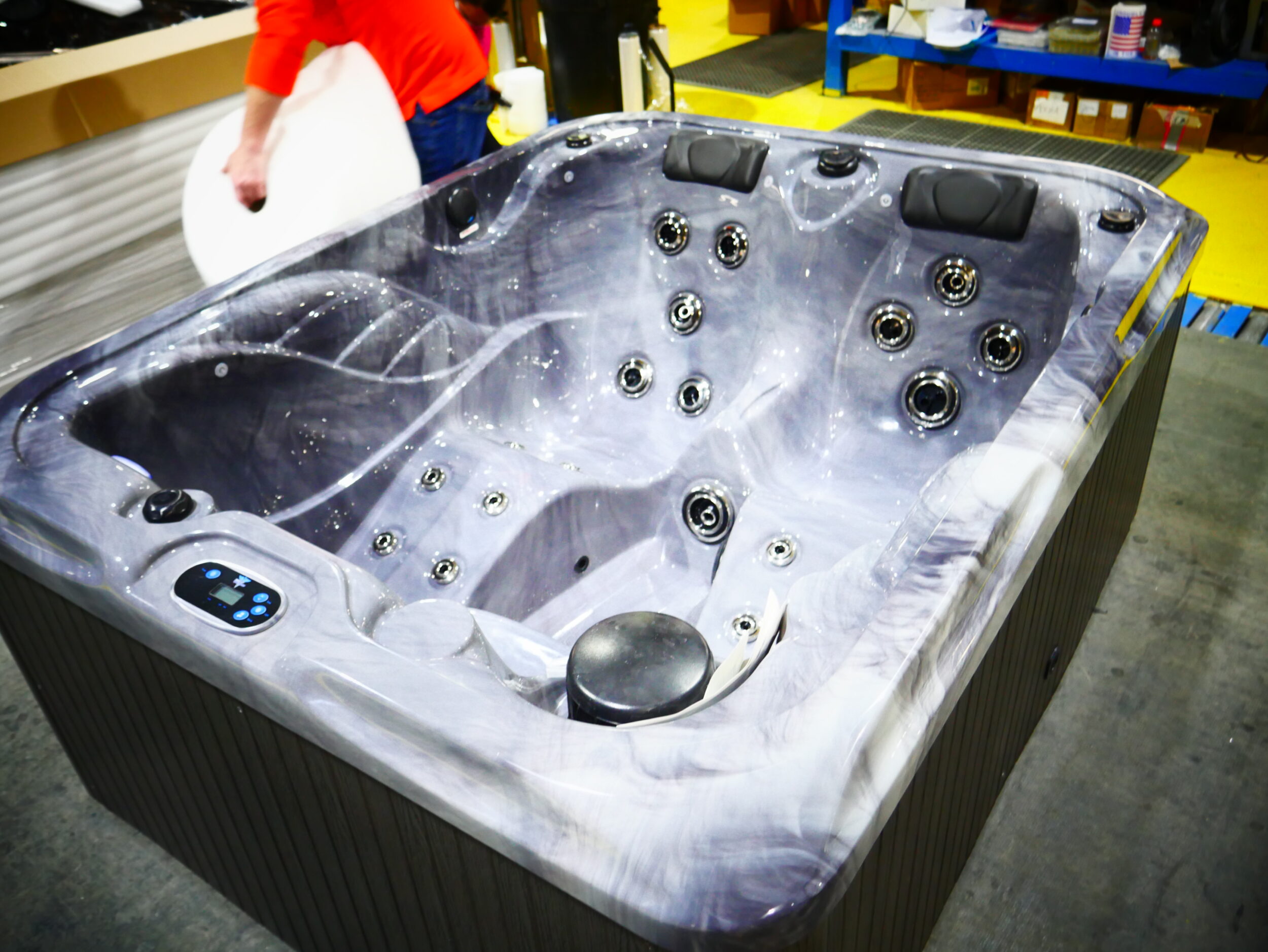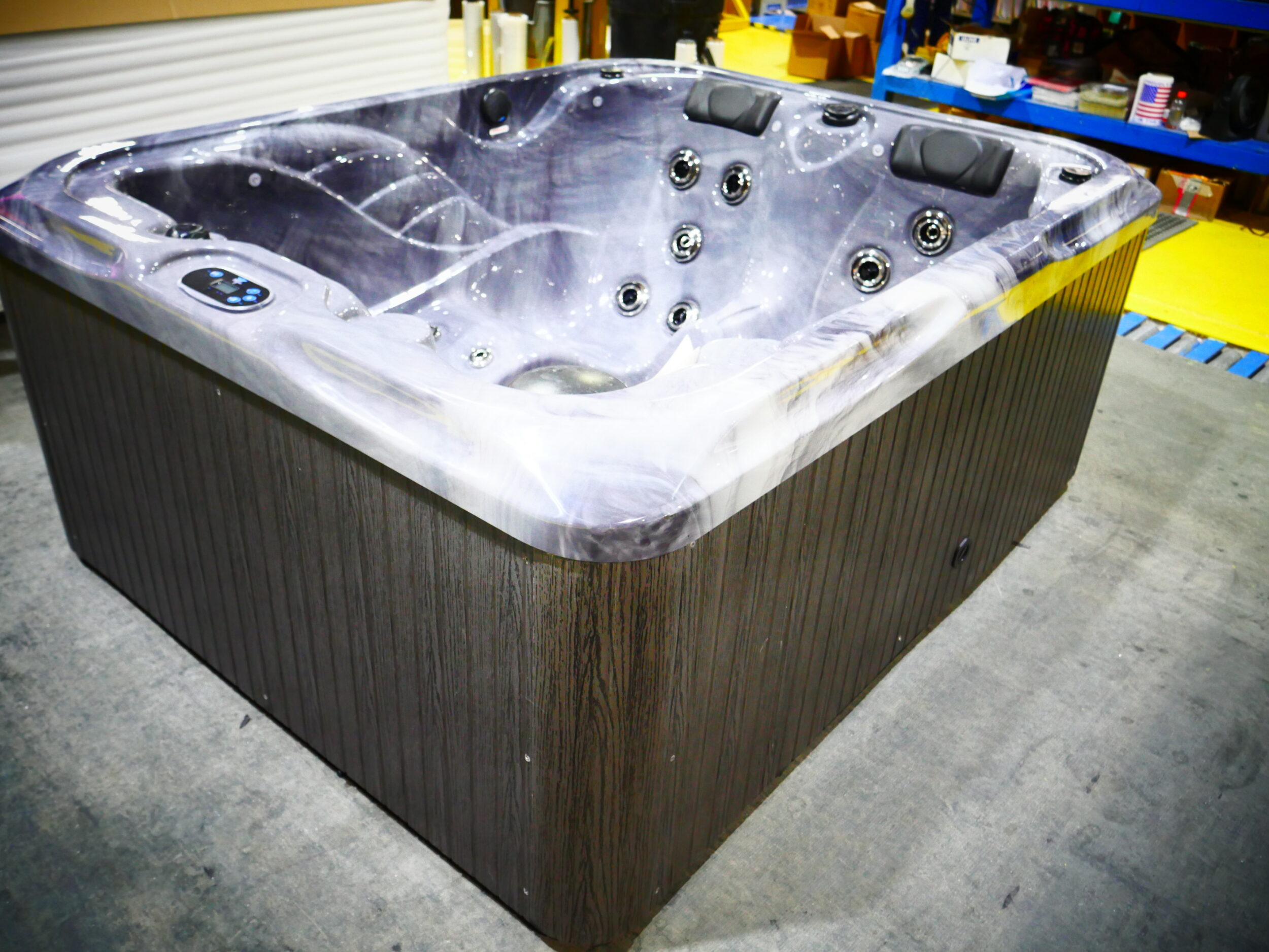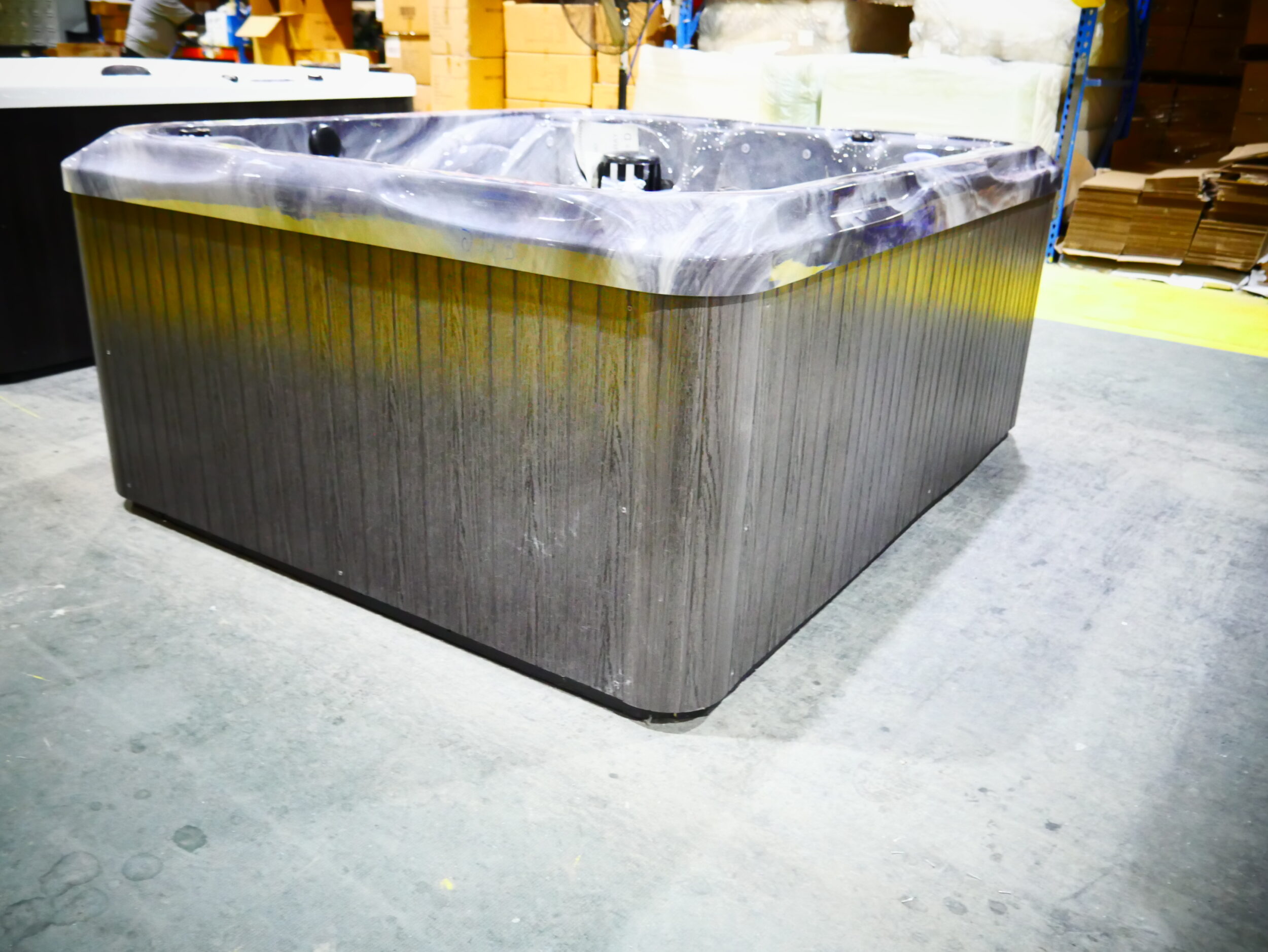 This spa is designed for 3 people to enjoy, including dual loungers for full body massage. This unit is made with storm cloud acrylic and gray cabinetry. It is upgraded with Wi-Fi and UV/Circ.