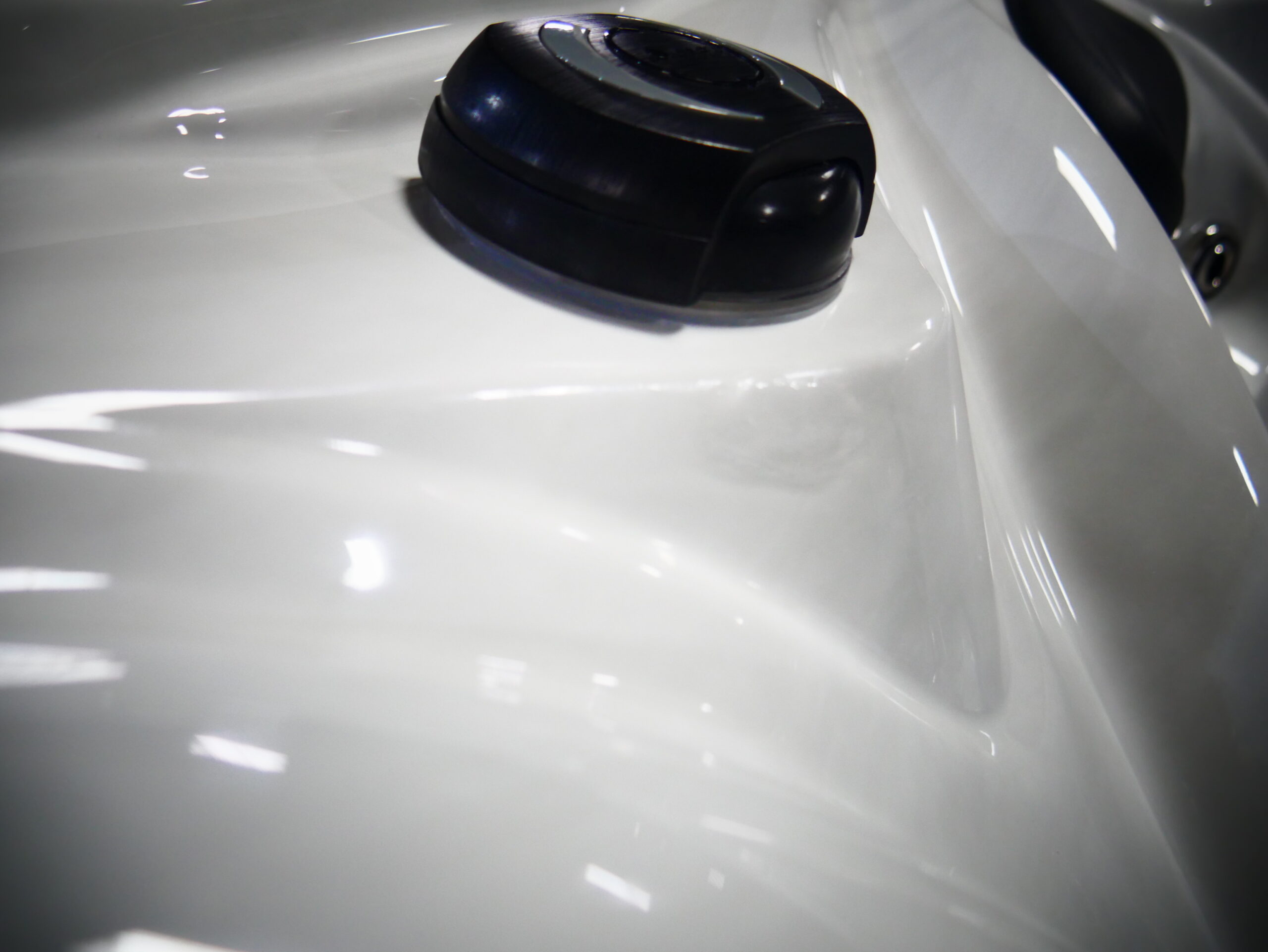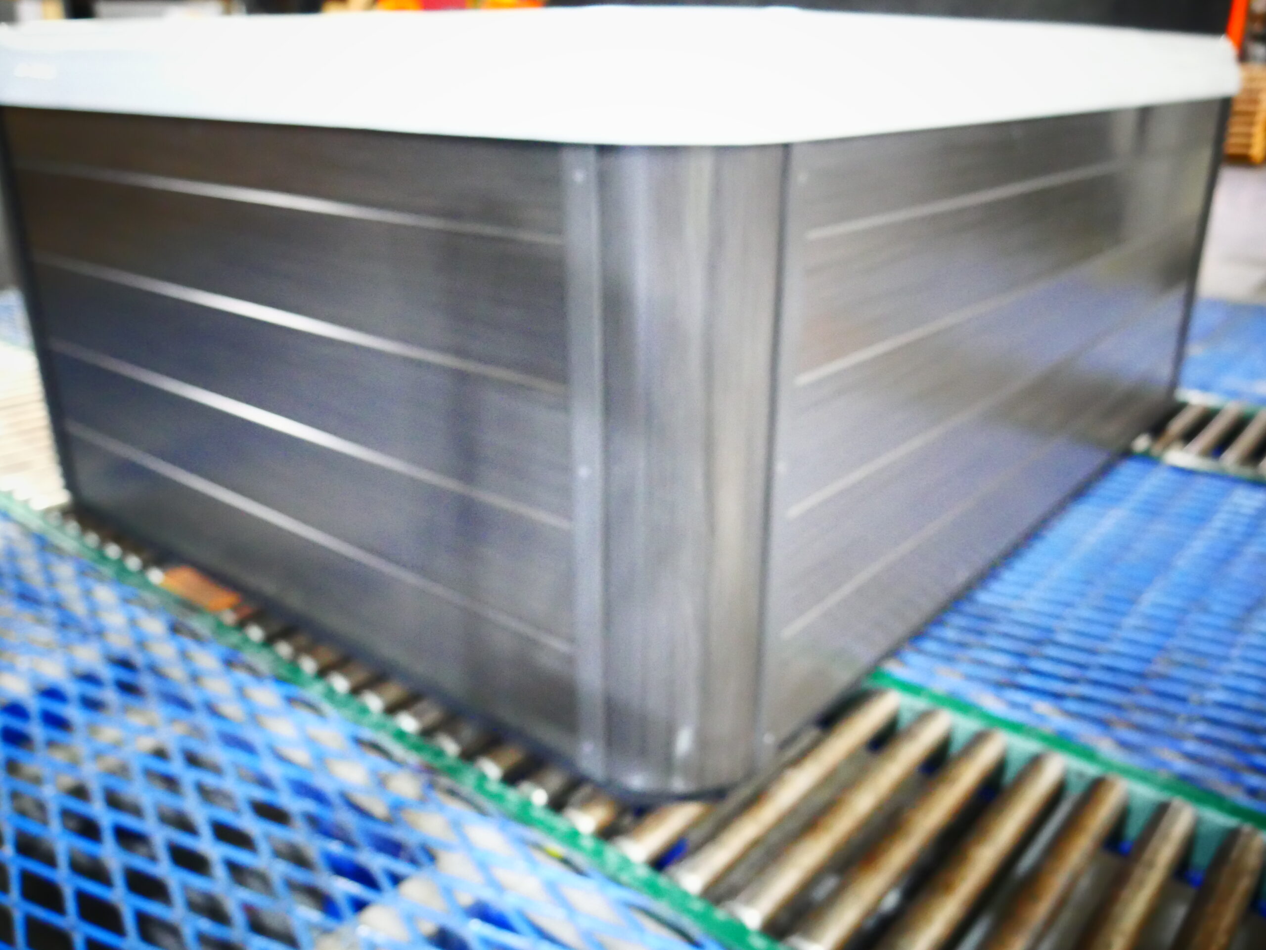 This spa is designed for 3 people to enjoy, including dual loungers for a full body massage. This unit is made with sterling acrylic and gray cabinets.