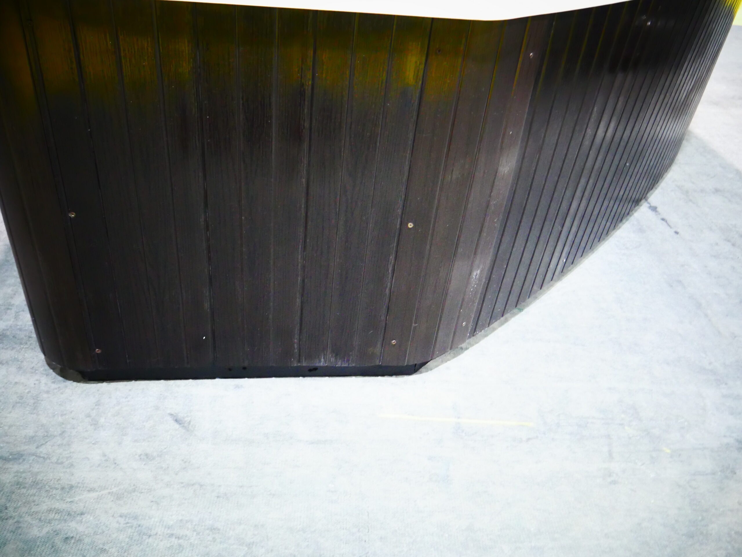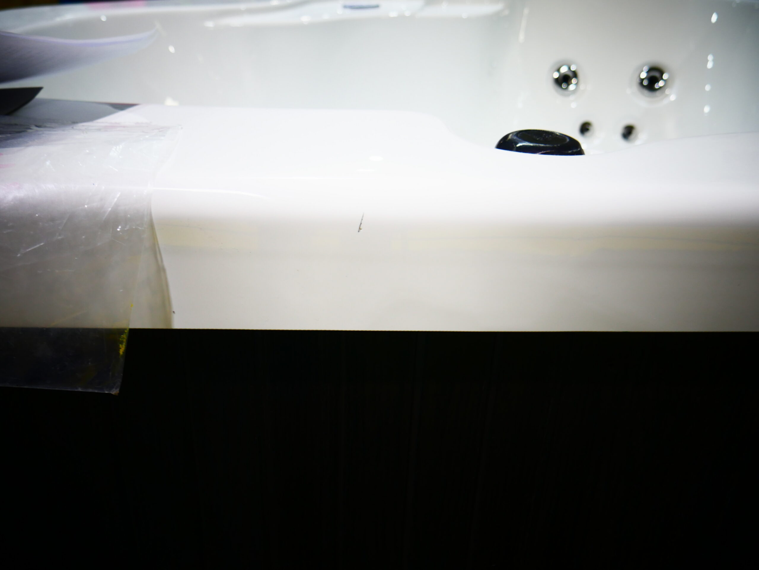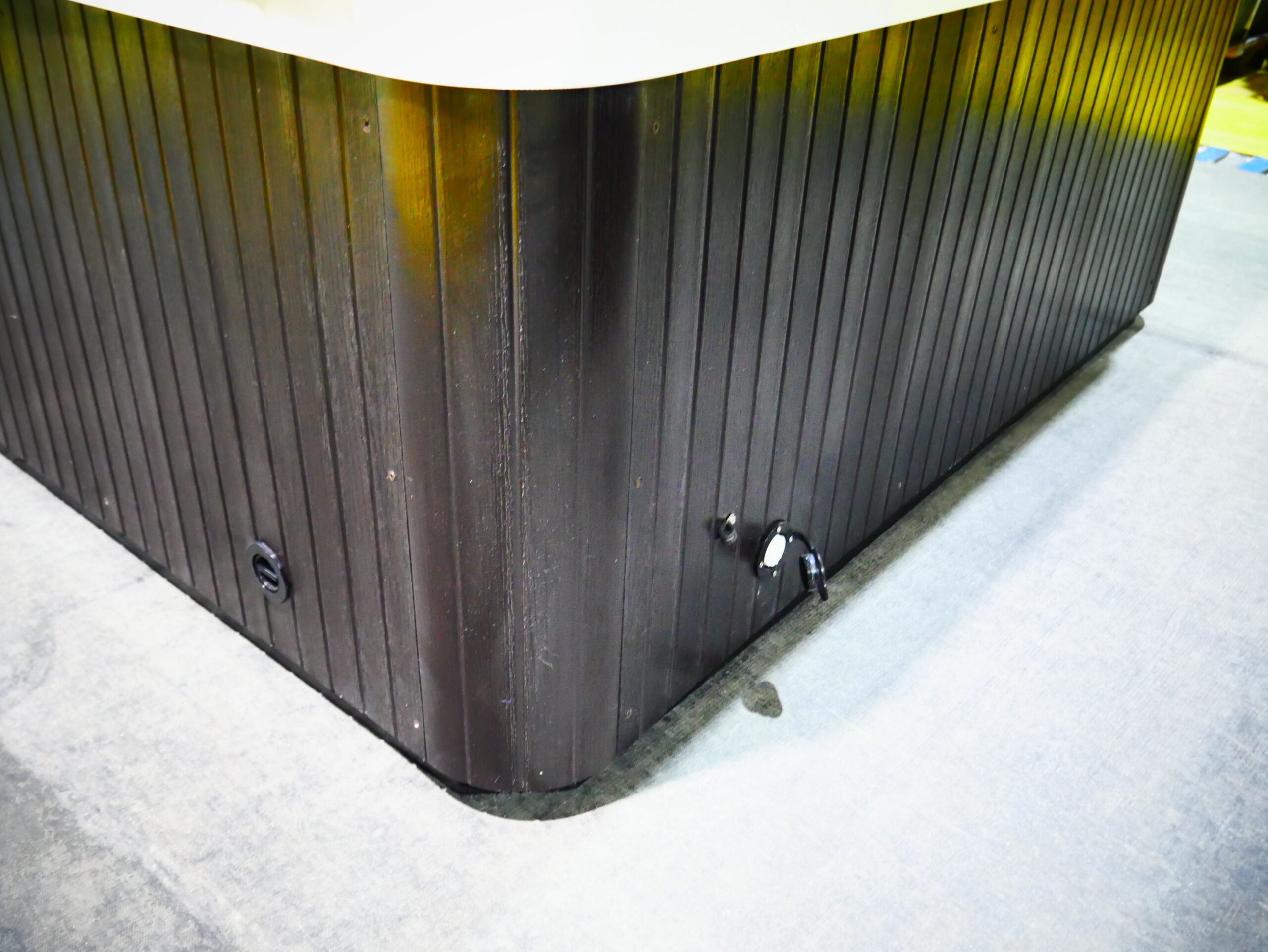 This corner spa is designed for 3 people to enjoy and to fit into tight spaces. This unit is made with white acrylic and mocha cabinets.