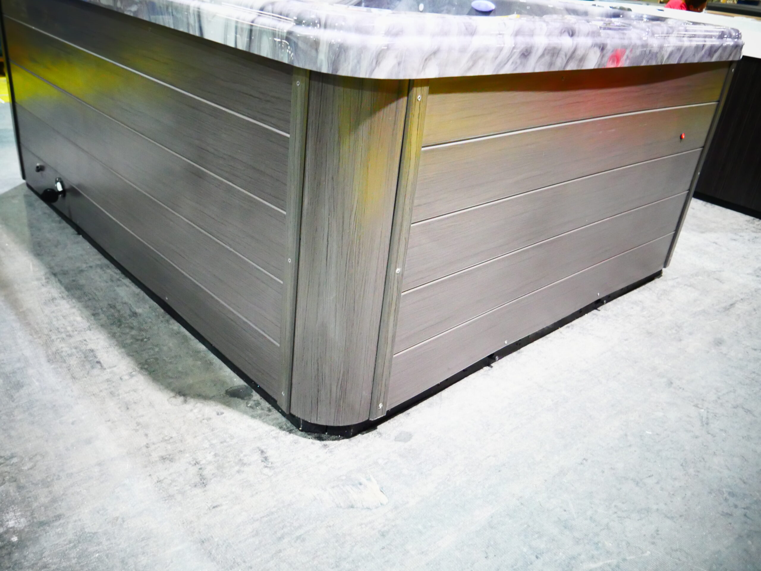 Designed for up to 5 people to enjoy comfort and luxury, this unit is made with storm cloud acrylic and gray cabinetry.