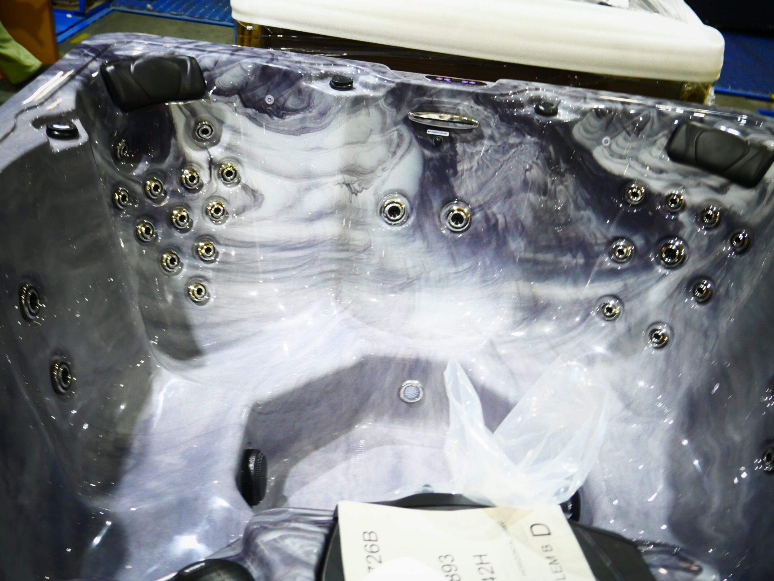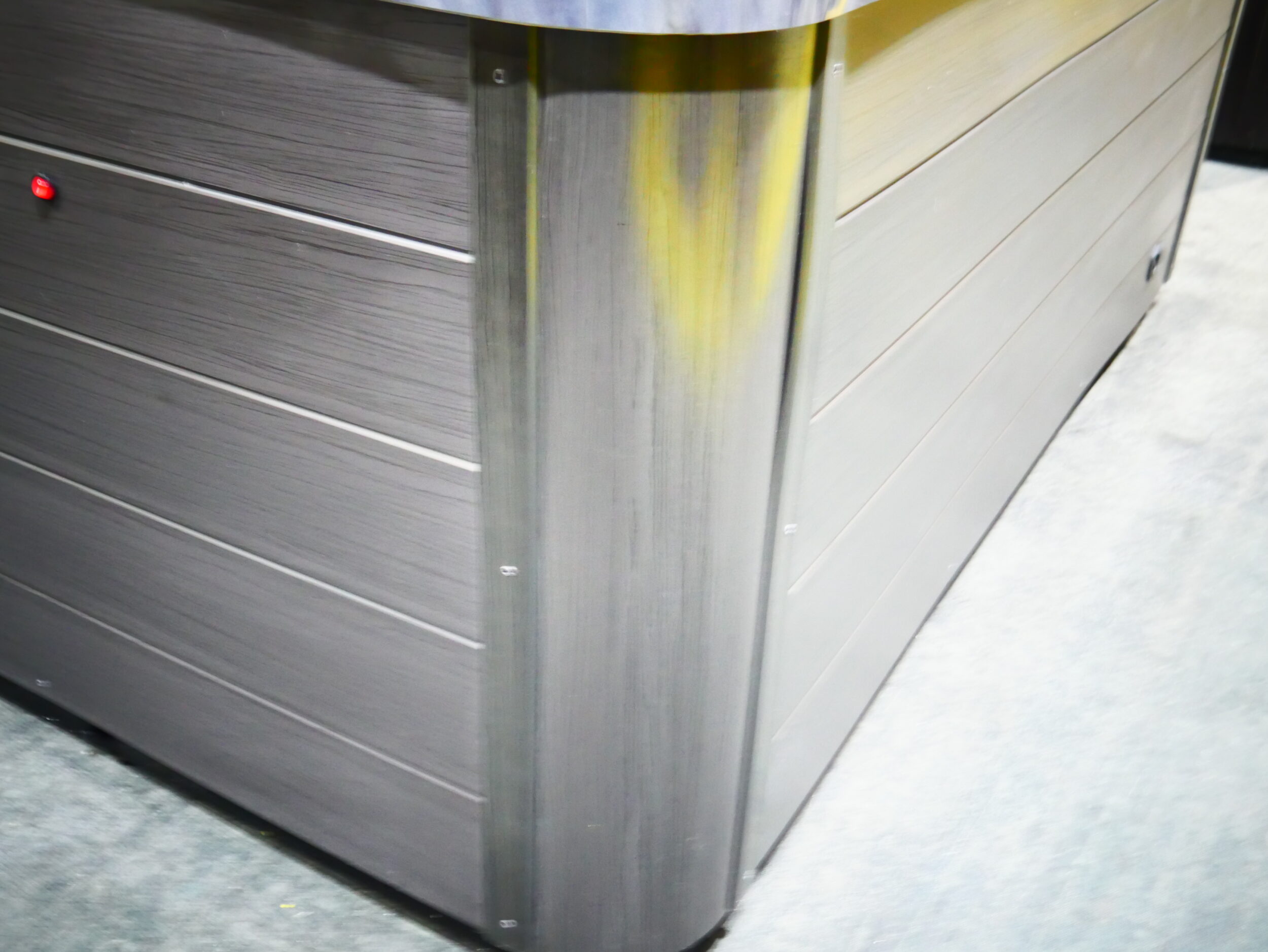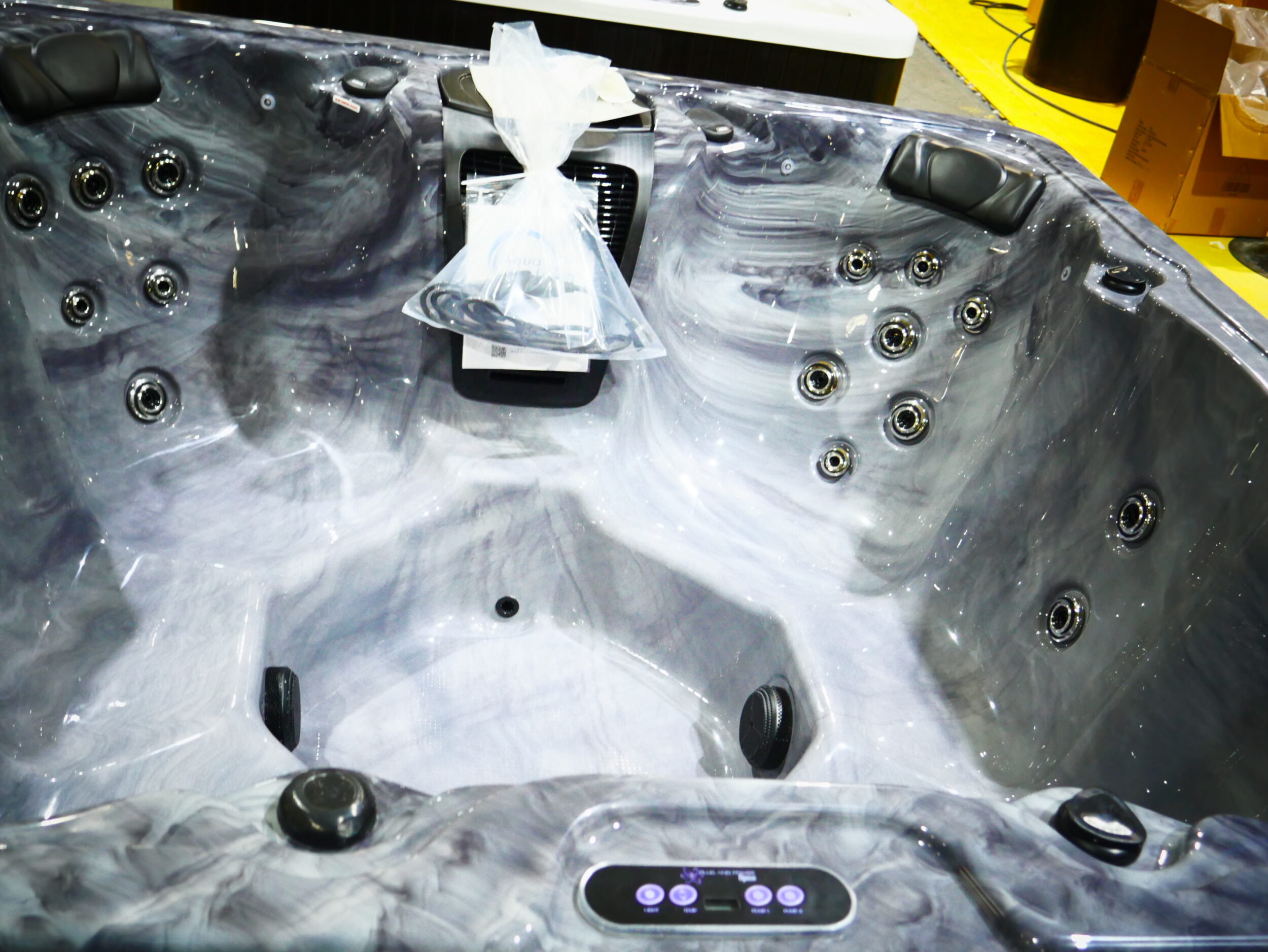 Designed for up to 7 people to enjoy comfort and luxury, this unit is made with storm cloud acrylic and gray cabinetry.